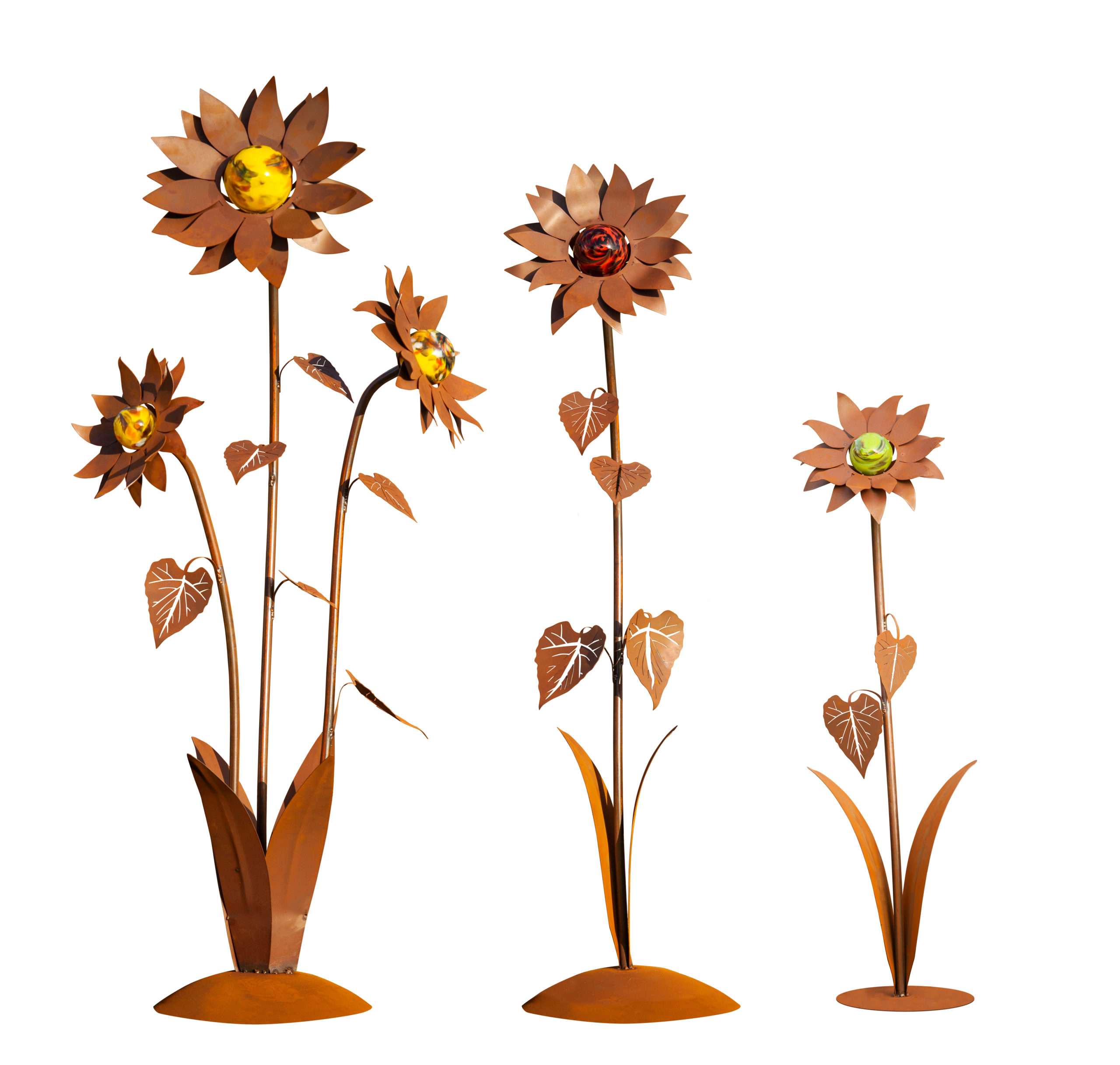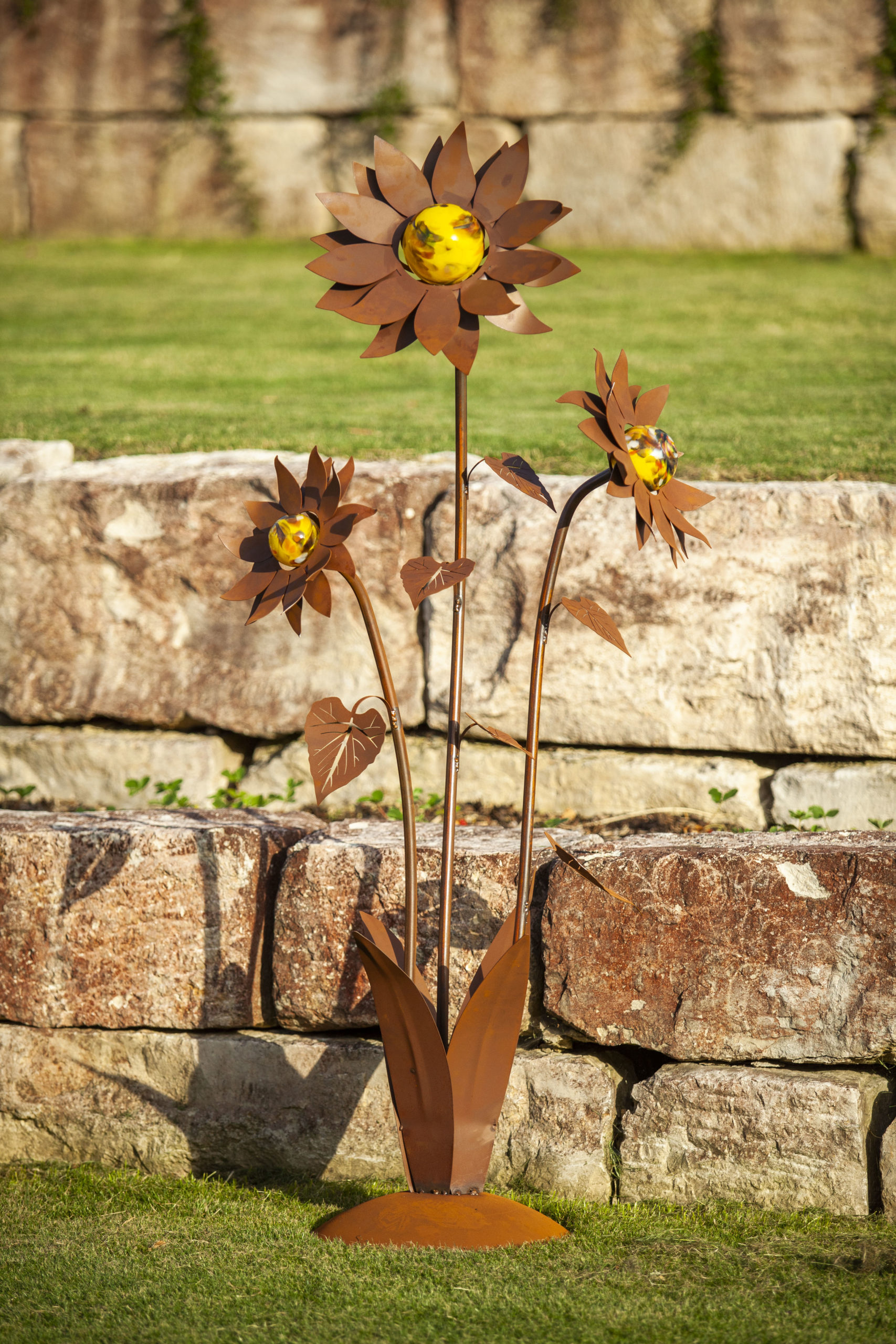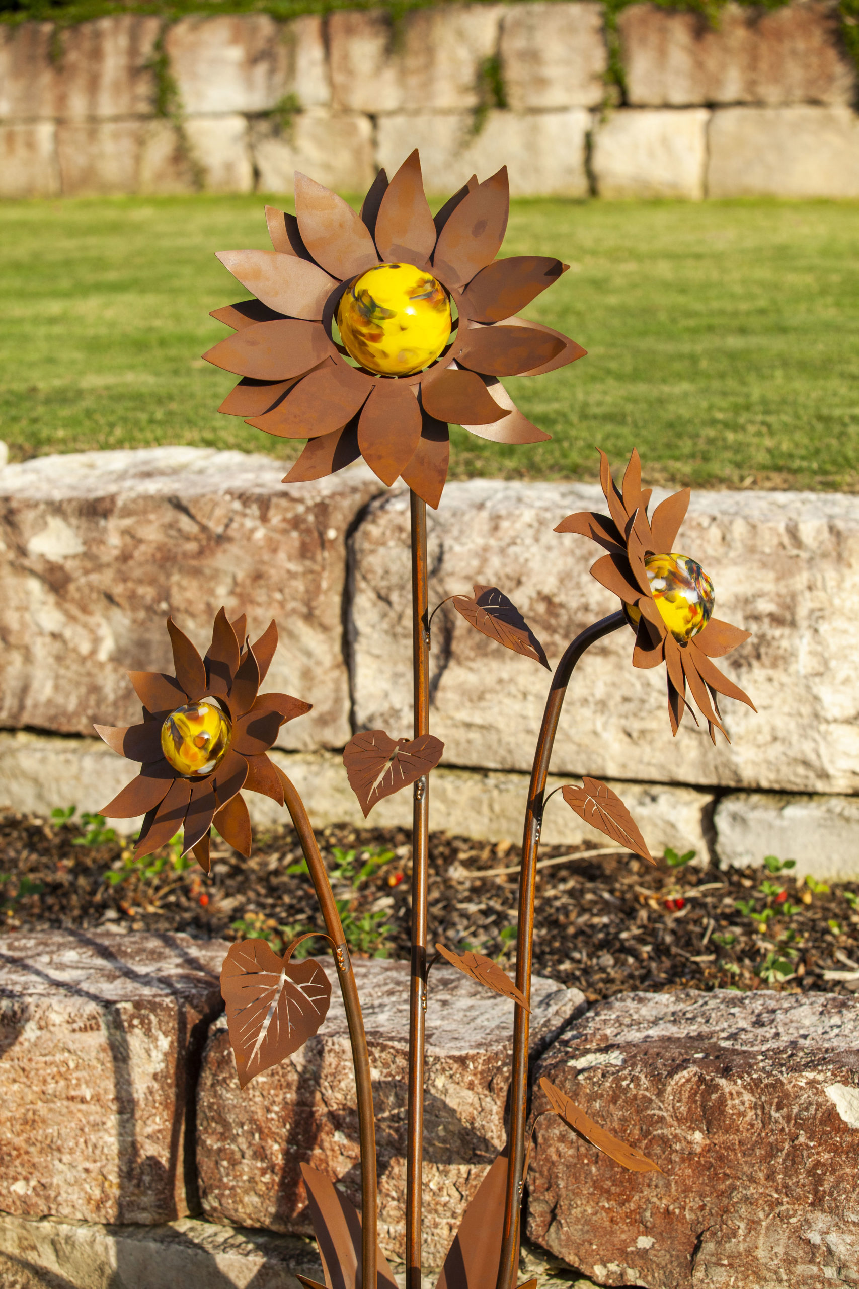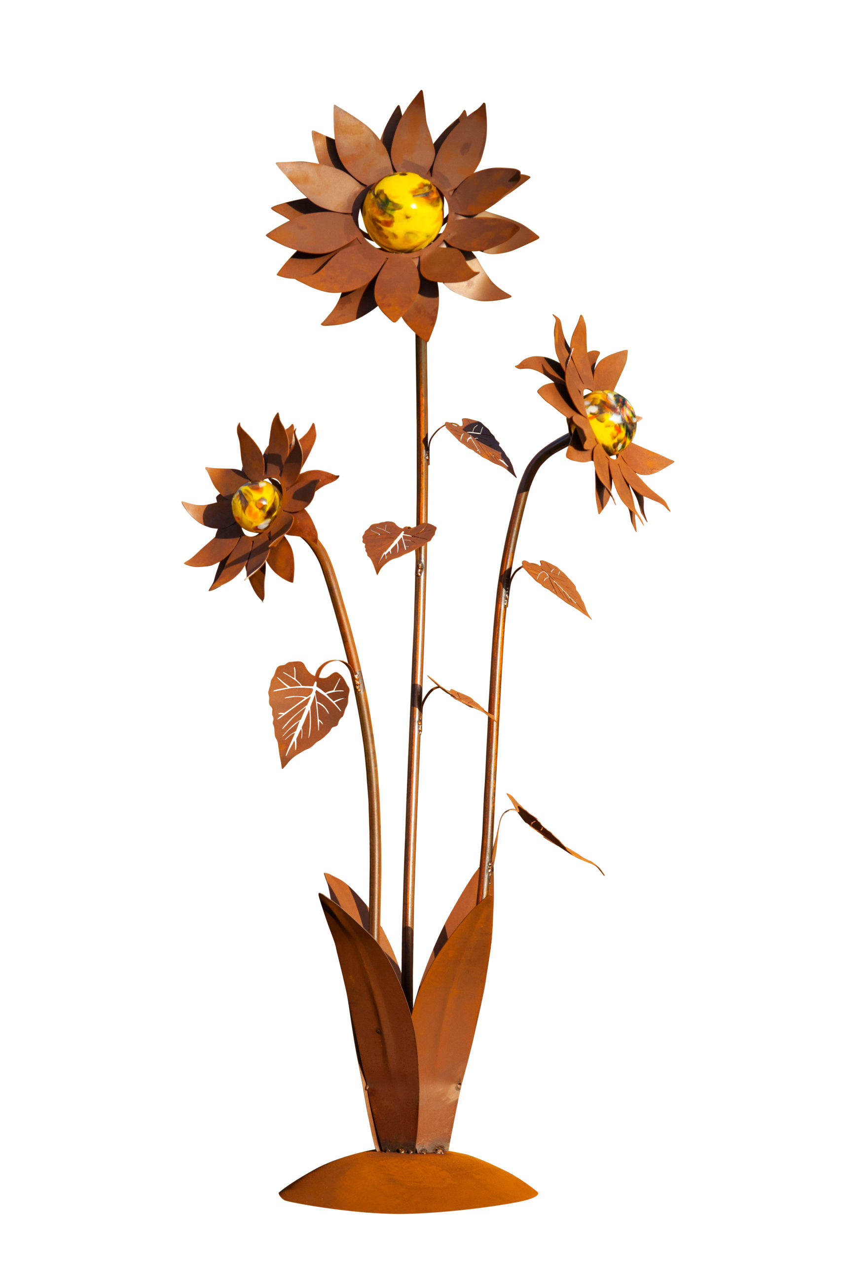 Decoratieve zonnebloem voorzien van drie glazen bollen, roest design