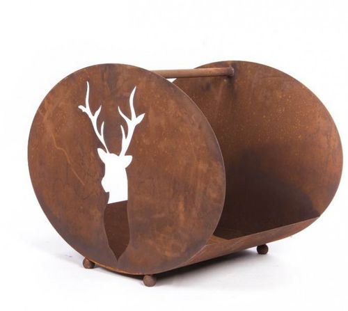 - Op een sfeervolle manier uw hout opslaan bij uw open haard of tuinkamer. Deze houtopslag, roest design, heeft een ovale vorm. De kleur en uitgesneden motief van een hertenkop geeft een warme scandinavische / winterse sfeer weer. Deze houtopslag is ook verkrijgbaar in een uitgesneden vlam motief.