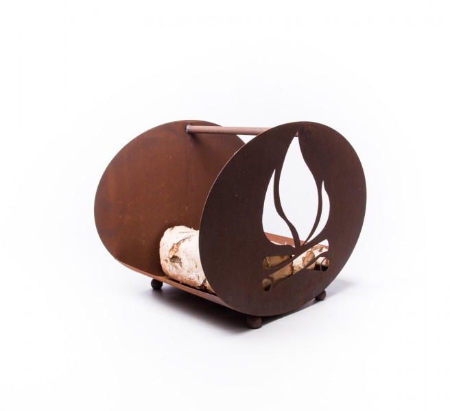 - Op een sfeervolle manier uw hout opslaan bij uw open haard of tuinkamer. Deze houtopslag, roest design, heeft een ovale vorm. De kleur en uitgesneden motief van een vlam geeft een warme winterse sfeer weer. Deze houtopslag is ook verkrijgbaar in een uitgesneden hertenkop motief.