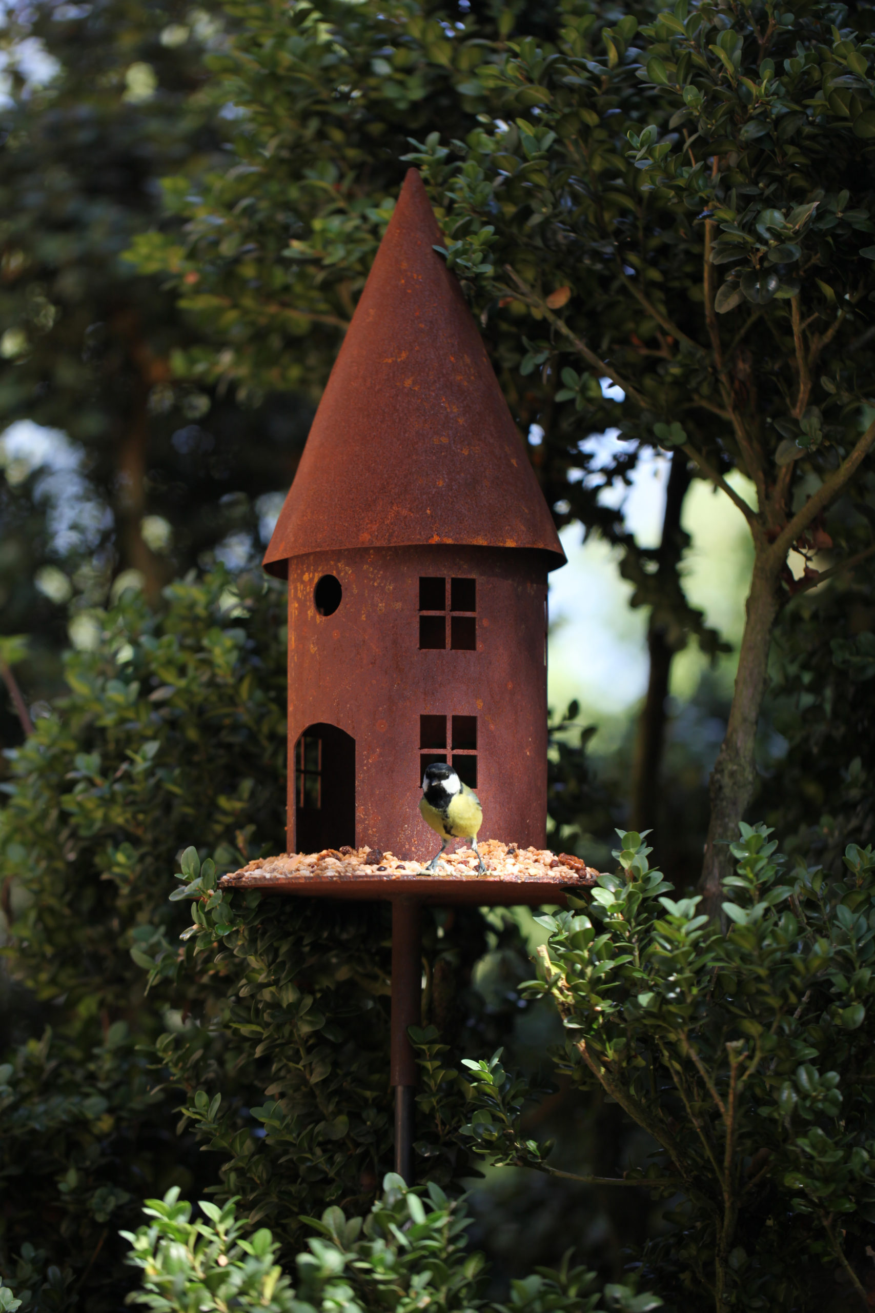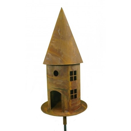 Vogelhuisje rond met grondstang, hoogte 45 cm met hoekige ramen, roest design