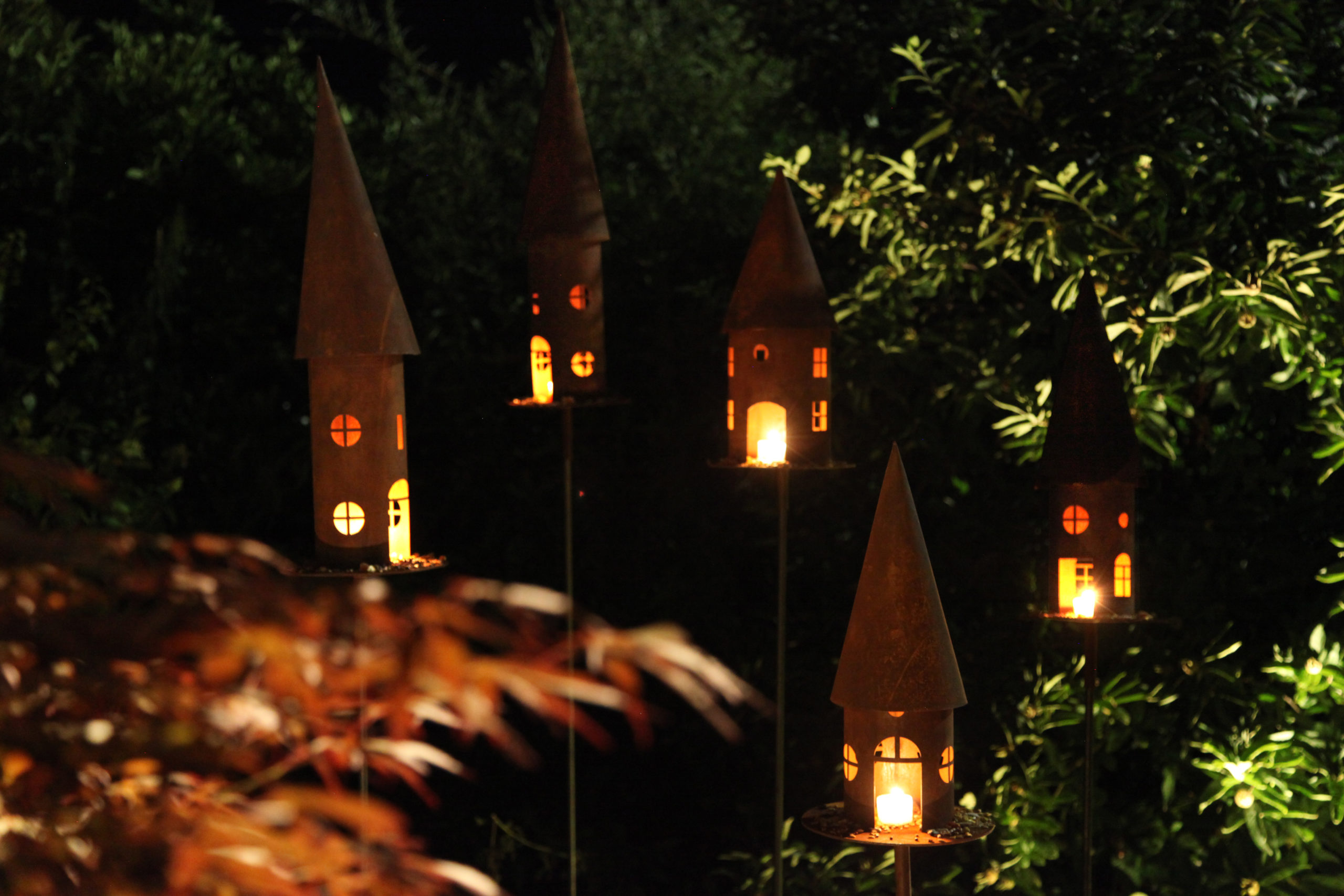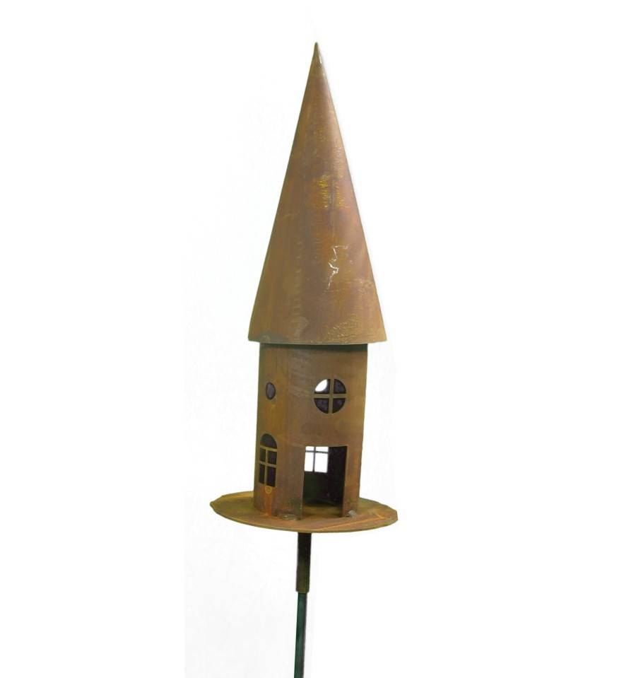 Vogelhuisje rond met grondstang, hoogte 53 cm met hoekige ramen, roest design