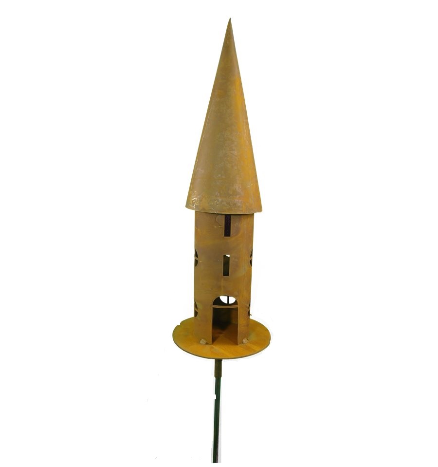 Vogelhuisje rond met grondstang, hoogte 66 cm met hoekige ramen, roest design